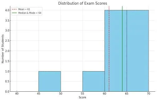 ● The green line at 64 marks both the mode and the median, showing that most students scored around this value.